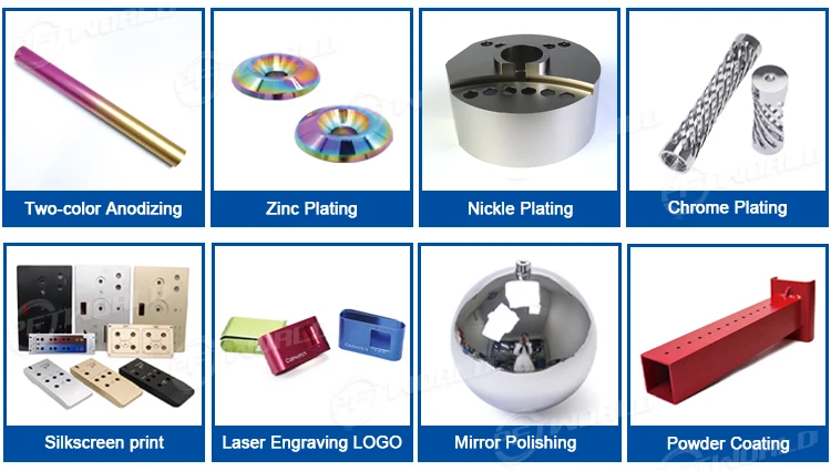 Анодирование, шариковая струя, шелкография, напыление PVD, гальваническое покрытие цинком/никелем/хромом/титаном, шлифовка, окраска, порошковое покрытие, пассивация, электрофорез, электрохимическая полировка, профилирование, лазерная/гравировальная обработка и т.д.